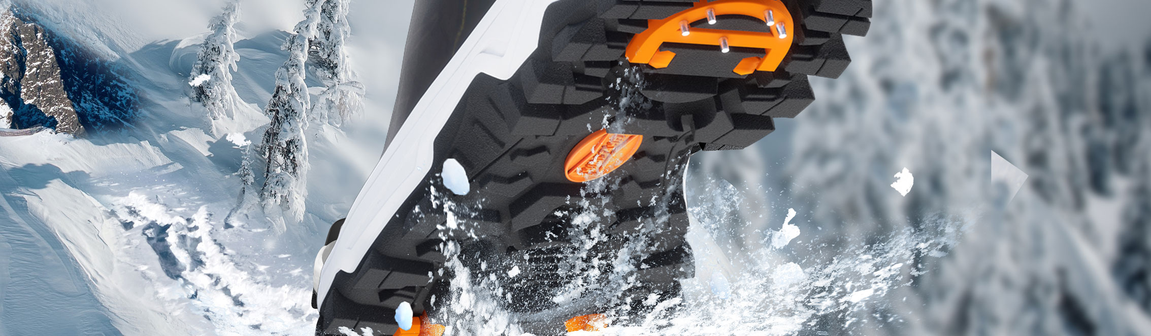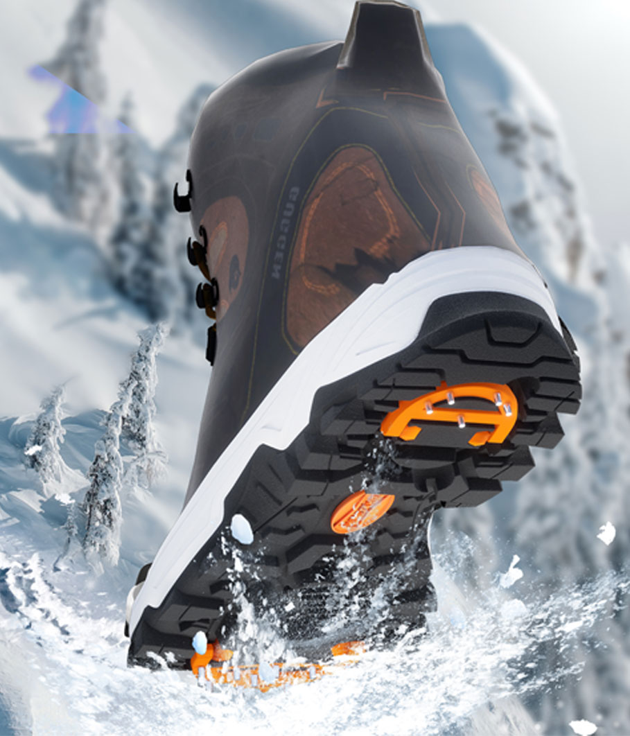 冰面、抗?jié)窕够夹g(shù)+可翻轉(zhuǎn)鋼爪抓地止滑技術(shù)。鑫銘鞋材科技有限公司針對鞋底在雪地、釣魚、登山等特殊地理環(huán)境易打滑的情況,這將嚴重影響穿著者運動便利性和安全性。因此,鑫銘鞋材科技有限公司研制出先進解決方案:全地形抓地止滑技術(shù)AII TERRAIN GRIP。