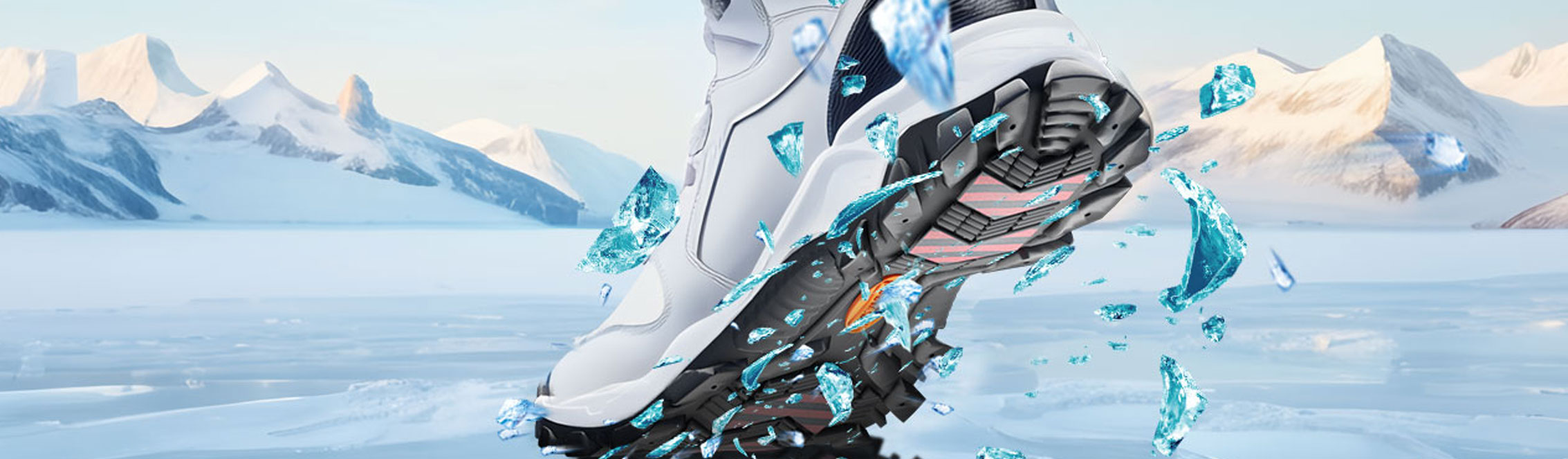 Ice Brake制品巧妙的設(shè)計(jì)在鞋底底部的幾個(gè)關(guān)鍵著力點(diǎn),讓鞋底全地質(zhì)、全天候的適應(yīng)各種地形和路面,無(wú)論在冰面、巖石、沙礫、水泥、瓷磚、木質(zhì)等路面,穿著者可輕便快捷地行動(dòng),步履穩(wěn)健。